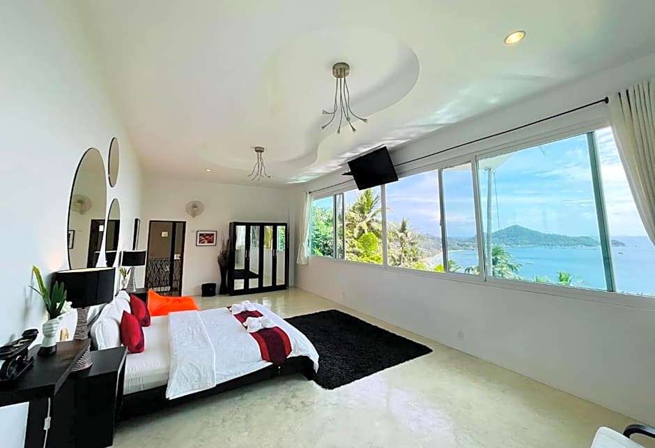 This villa has a stunning sea views balcony, private pool and kitchen. It has a flat-screen satellite TV and DVD player. The Five-Bedroom Villa with private pool now includes the fastest and most reliable wifi6 available on Koh Tao, a premium sound system, premium TV programing through Roku Ultra, fresh coffee and fruit provided, and free 24-hour taxi service to all of our guests!